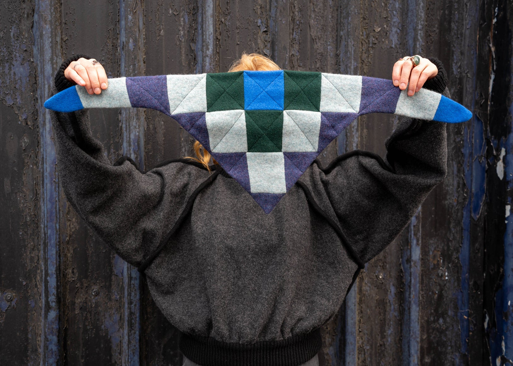 A limited collection of unique neck triangles in collaboration with Toni and Anna. These items are all one of one, made using knitted wool offcuts from Anna combined in new ways by Toni to create 10 unique patchwork scarfs. The material is 100% lambswool on one side combined with deadstock material found in secondhand shops across Europe on the other and a hand embroidered logo. Machine wash on woolcycle on cold.